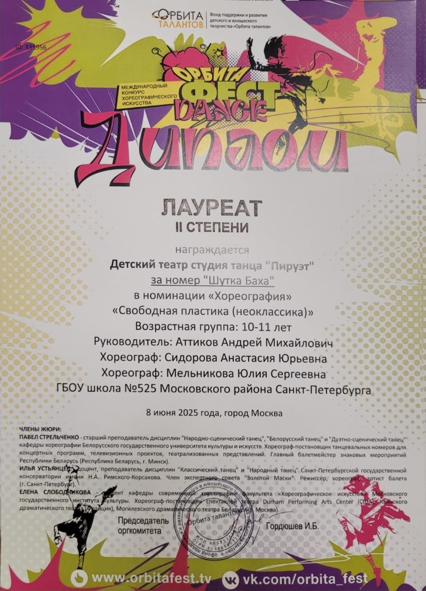 В июне 2025 года получение звания Лауреата II степени в Международном конкурсе хореографического искусства «Орбита фес dance».